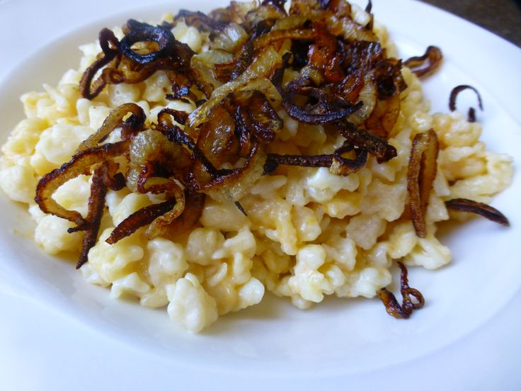 - Serve: Add the caramelized onions to the top of the baked Käsknöpfle and serve hot with a side of applesauce!